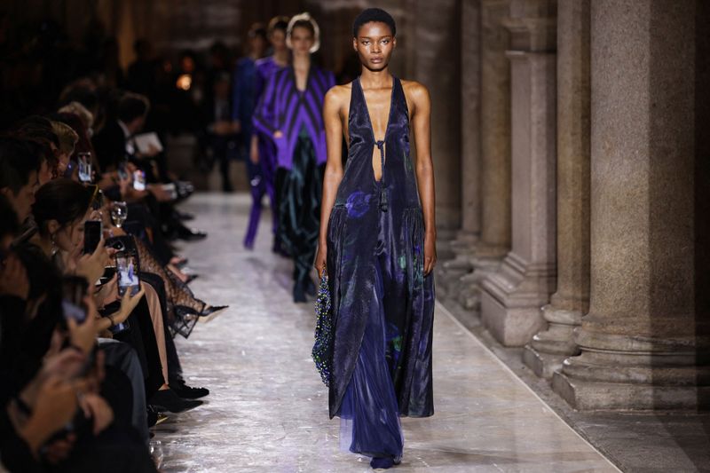 शो का समापन अग्निस ज़ोगला द्वारा एक एकल वॉक के साथ किया गया, जो डिजाइनर के पसंदीदा मॉडल में से एक था, जिसने एक सुरुचिपूर्ण नीला गाउन पहना था।