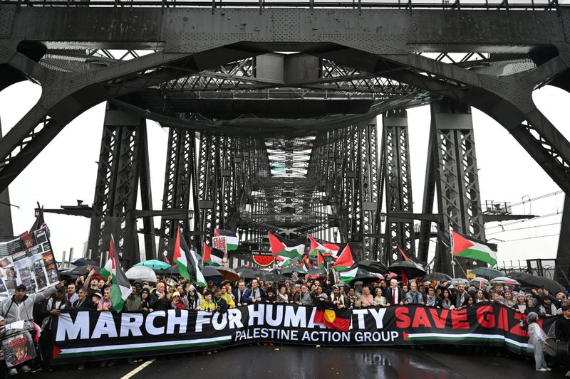 कहीं और, हजारों प्रदर्शनकारियों ने रविवार को सिडनी के प्रतिष्ठित हार्बर ब्रिज पर मार्च करने के लिए बारिश की बारिश की, जो युद्धग्रस्त गाजा पट्टी में शांति और सहायता प्रसव के लिए बुला रहे थे।