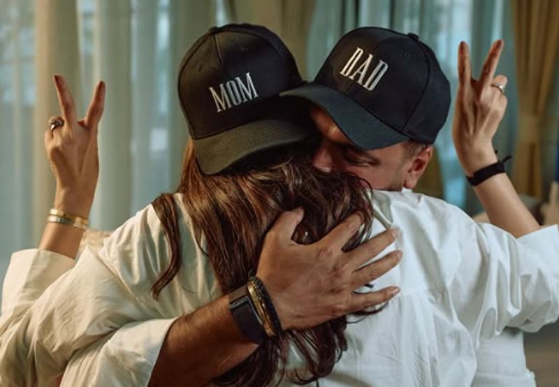 पहली तस्वीर में वह और बंगेरा टोपी पहने हुए थे, जिस पर “मॉम” और “डैड” लिखा हुआ था, इसके बाद दम्पति की तस्वीरें थीं, जिसमें वे बच्चे के जूते पकड़े हुए थे।