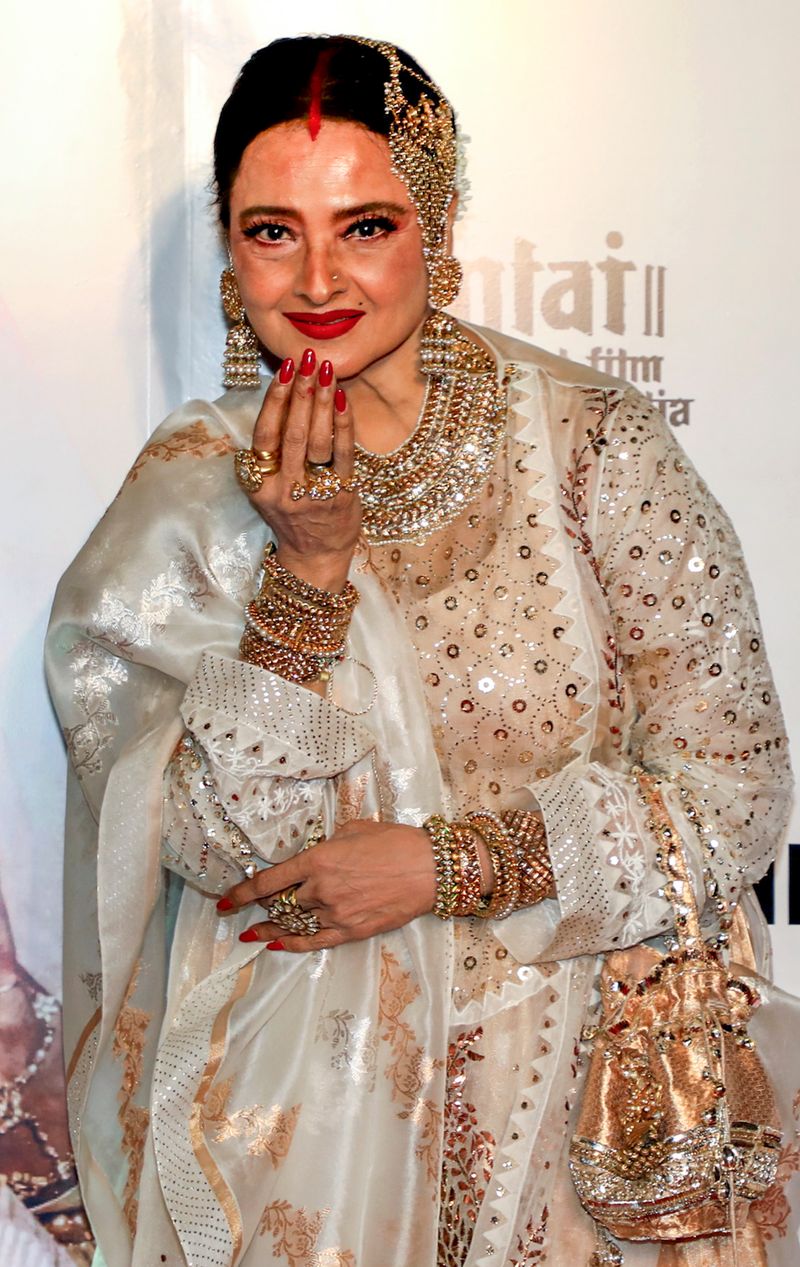 रेखा ने गोल्डन कढ़ाई के साथ एक पारंपरिक संगठन में सभी को स्तब्ध कर दिया, जो फिल्म से उम्राओ जान के उनके प्रतिष्ठित चरित्र की याद दिलाता है। उन्होंने निर्देशक और ऐस संगीत संगीतकार आर रहमान के साथ कैमरे के लिए पोज़ दिया।