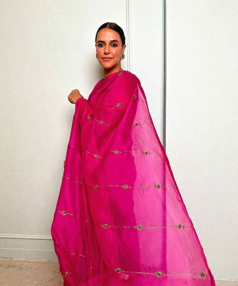 नेहा धूपिया चमकीले गुलाबी या रानी रंग के शेड में बेहद खूबसूरत लग रही हैं। समृद्ध कपड़ा खूबसूरती से लिपटता है, एक परिष्कृत सुंदरता का प्रदर्शन करता है। अपने बालों को पीछे खींचे हुए और आकर्षक झुमके के साथ, वह अनुग्रह और पारंपरिक आकर्षण का प्रतीक है, जो इसे एक शाम के कार्यक्रम के लिए एक आदर्श लुक बनाता है।