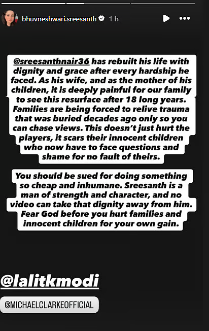 एक डरावने सोशल मीडिया पोस्ट में, भुवनेश्वरी ने अपनी नाराजगी व्यक्त की, इस अधिनियम को “घृणित, हृदयहीन और अमानवीय” कहा। उसने मोदी और क्लार्क पर 18 साल पुरानी घटना को “सस्ते प्रचार और विचारों” के लिए विशुद्ध रूप से खींचने का आरोप लगाया। उन्होंने जोर देकर कहा कि उनके पति, श्रीसंत और हरभजन दोनों लंबे समय से घटना से आगे बढ़े हैं और अब स्कूल जाने वाले बच्चों के साथ पिता हैं। उन्हें एक दर्दनाक क्षण को दूर करने के लिए मजबूर करने का कार्य, उन्होंने कहा, पुराने घावों का एक क्रूर और अनावश्यक उद्घाटन था।