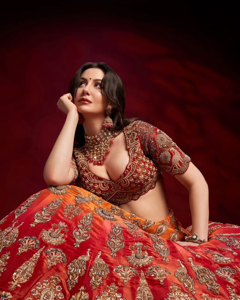 जटिल सोने की कढ़ाई के साथ यह आश्चर्यजनक मूंगा-लाल लेहेंगा अपने सबसे अच्छे रूप में दुल्हन लालित्य का प्रतीक है। भारी अलंकृत चोली को वॉल्यूमिनस स्कर्ट के साथ जोड़ा गया है जो परंपरा और ग्लैमर का एक आदर्श संतुलन बनाता है। Giorgia का स्टेटमेंट ज्वैलरी और फ्लॉलेस स्टाइलिंग यह किसी भी भव्य उत्सव के लिए बिल्कुल लुभावनी है।