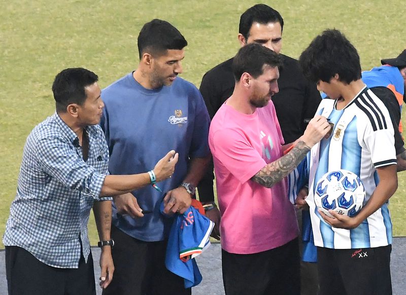 ’30 बच्चों वाला फुटबॉल क्लिनिक’ मेस्सी और उनके दोस्तों और कुछ 10-वर्षीय बच्चों के बीच एक किक-अबाउट बन गया क्योंकि वे वन-टच पासिंग खेल रहे थे। फिर बड़ा शो आया, जहां सुरक्षा और सोशल मीडिया टीम से घिरे मेस्सी ने स्टेडियम में सम्मान की गोद ली। अपने प्रशंसकों की सराहना करते हुए, मेस्सी कभी-कभी भीड़ में फुटबॉल को मारने के लिए अपने दिव्य बाएं पैर का इस्तेमाल करते थे। उन्होंने मोहिंदर अमरनाथ स्टैंड के शीर्ष स्तर पर एक गेंद फेंकी, जिससे भीड़ में कई लोगों को अविश्वास और भय हुआ। इससे पहले मेस्सी ने कुछ प्रशंसकों को तस्वीरें और ऑटोग्राफ देकर सम्मानित किया।