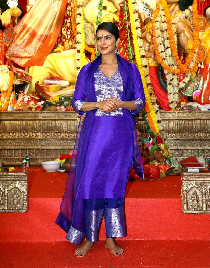 एक शाही नीले रंग के सूट में कपड़े पहने, प्रियंका ने देवी वाइब्स को देवी दुर्गा के लिए प्रार्थना की। पैप्स द्वारा कैप्चर किए गए दृश्यों में, मैरी कोम स्टार को पंडाल में मौजूद भक्तों के लिए अपने अभिवादन को बढ़ाते हुए देखा जा सकता है।