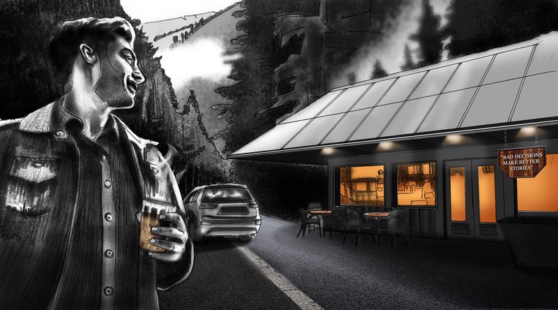 और फिर, जैसा कि भाग्य को मंजूर था, उस स्टॉल के ठीक पीछे एक और कैफे था। वहाँ एक बोर्ड ने घोषणा की: “बुरे निर्णय बेहतर कहानियाँ बनाते हैं।”
