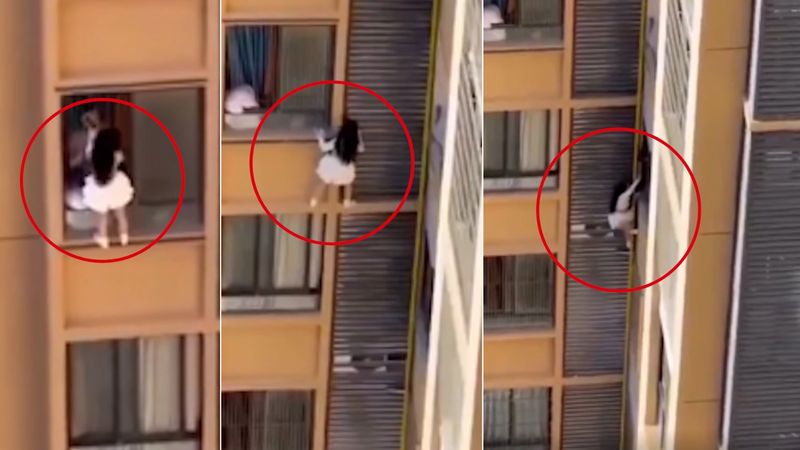 सोशल मीडिया पर एक वीडियो वायरल हो गया है जिसमें चीन में एक महिला अपने प्रेमी की पत्नी से बचने की कोशिश करते हुए एक ऊंची इमारत की बालकनी से चिपक गई है, लेकिन पड़ोसी उसे सुरक्षित बाहर खींच लेता है।