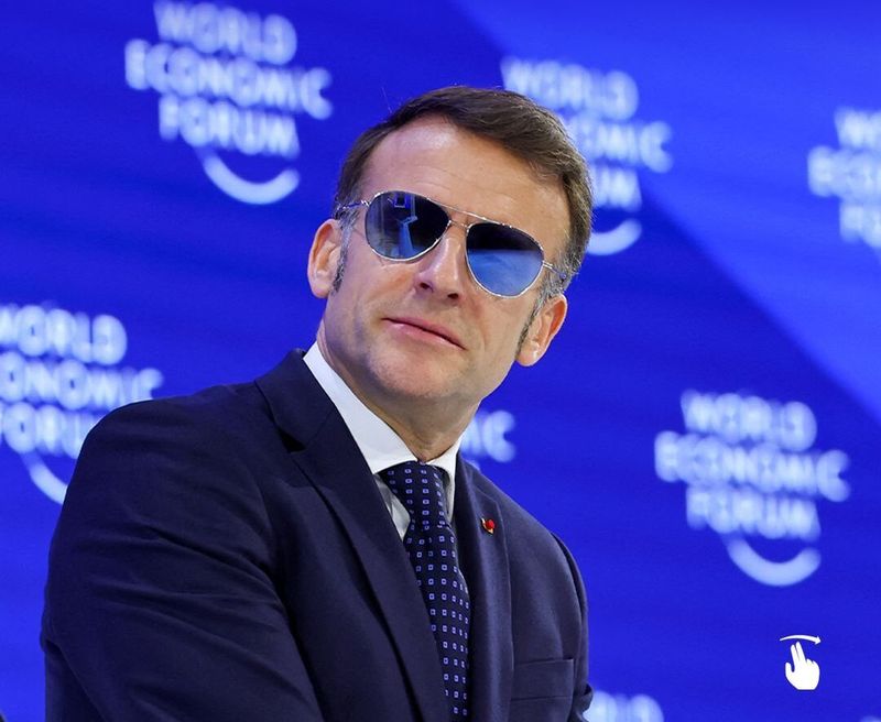दावोस में विश्व आर्थिक मंच पर, फ्रांसीसी राष्ट्रपति इमैनुएल मैक्रॉन ने हर किसी का ध्यान अपनी ओर आकर्षित किया – न केवल अपने भाषण के लिए, बल्कि घर के अंदर पहने हुए प्रतिबिंबित नीले रंग के धूप के चश्मे के लिए भी।