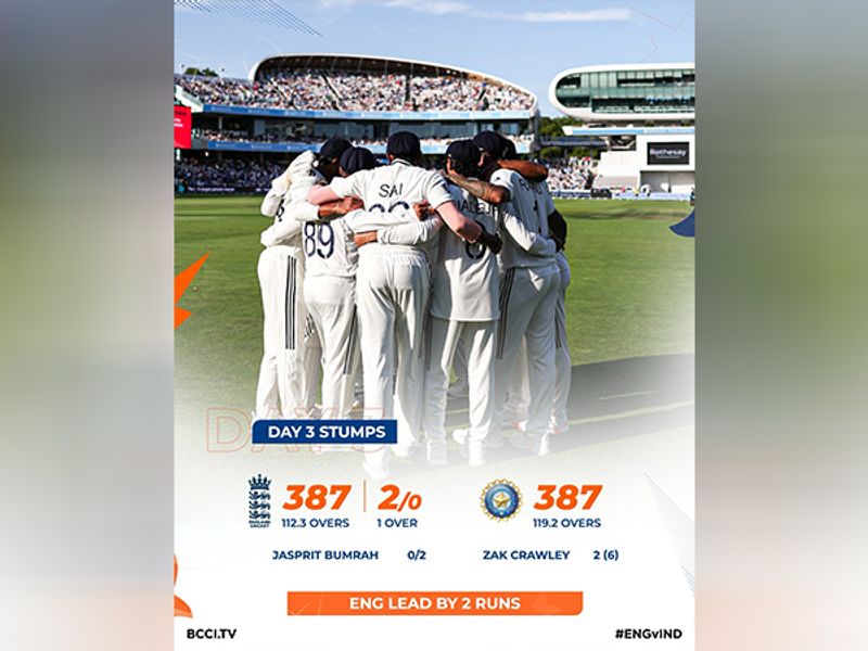 दिन 3 पर स्टंप्स में, इंग्लैंड Zak Crawley (2) और बेन डकेट (0*) के साथ 2/0 हैं, जो क्रीज पर नाबाद हैं। बेन स्टोक्स के नेतृत्व वाले पक्ष ने लॉर्ड्स टेस्ट के तीसरे दिन के पूरा होने के बाद खेल में दो रन की बढ़त बनाई है।
