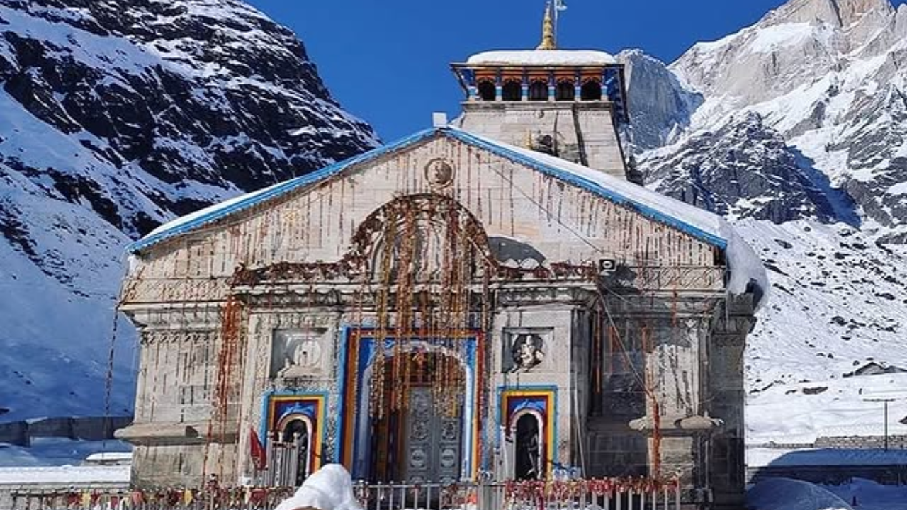 Kedarnath मंदिर, बर्फ में ढंका हुआ, सर्दियों की शुरुआती और तीव्र शुरुआत को दर्शाता है। मंदिर जमे हुए चोटियों से घिरा हुआ है, एक शानदार दृश्य जो कठोर सर्दियों के मौसम के लिए मंदिर के आसन्न समापन को चिह्नित करता है।