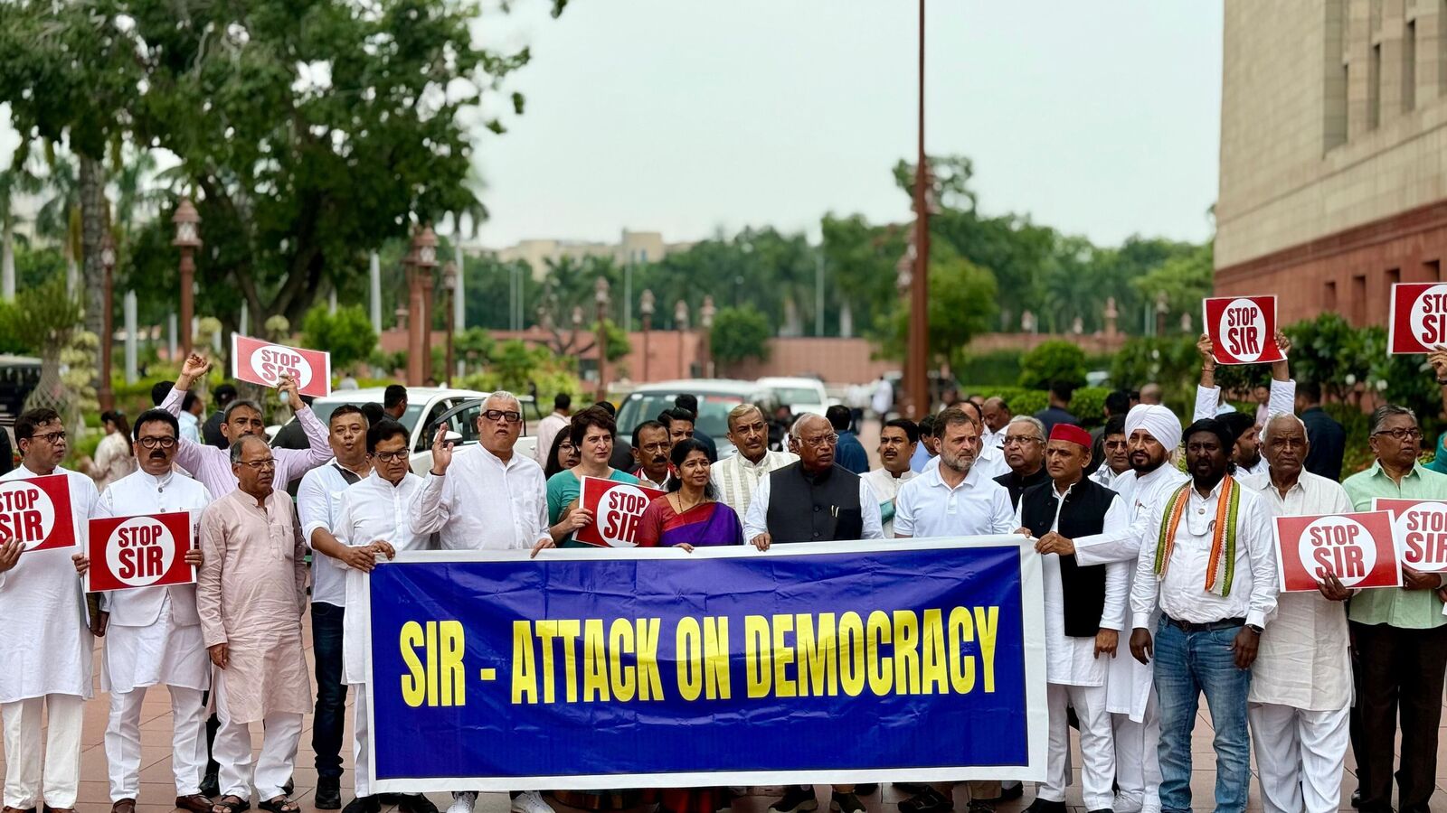 विरोध सांसदों भारत के ब्लाक ने मंगलवार को मंगलवार को संसद के मकर बटर में एक विरोध प्रदर्शन किया, दिन की कार्यवाही से पहले, चुनाव-बाउंड बिहार में चुनाव आयोग के विशेष गहन अभ्यास (एसआईआर) के खिलाफ केंद्र पर दबाव बढ़ाने के लिए।