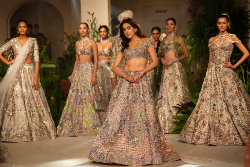 सारा बहुत खूबसूरत लग रही थी क्योंकि वह एक आश्चर्यजनक नरम गुलाब सोने के लेहेंगा में रैंप पर चलती थी, जिसमें जटिल पुष्प कढ़ाई थी। आउटफिट में पस्टेल और मेटालिक ह्यूज के संयोजन, विस्तृत काम थे।