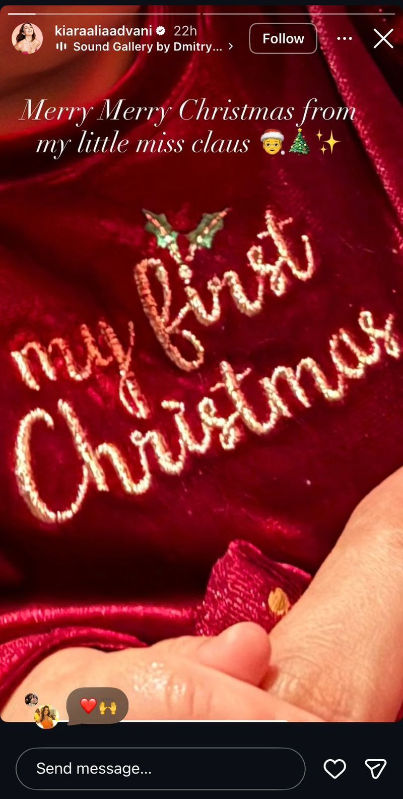 कियारा ने लाल मखमली पोशाक पहने बेबी सरायाह की एक क्लोज-अप छवि पोस्ट की, जिस पर सोने से “मेरा पहला क्रिसमस” लिखा हुआ था। तस्वीर में केवल बच्चे के छोटे हाथ और ठोड़ी दिखाई दे रही थी, जिससे उस क्षण के जादू को कैद करते हुए गोपनीयता बनाए रखी जा सके। एक चंचल उत्सव नोट जोड़ते हुए, किआरा ने पोस्ट को कैप्शन दिया, “मेरी छोटी मिस क्लॉज़ की ओर से मेरी क्रिसमस,” छुट्टियों के इमोजी के साथ।