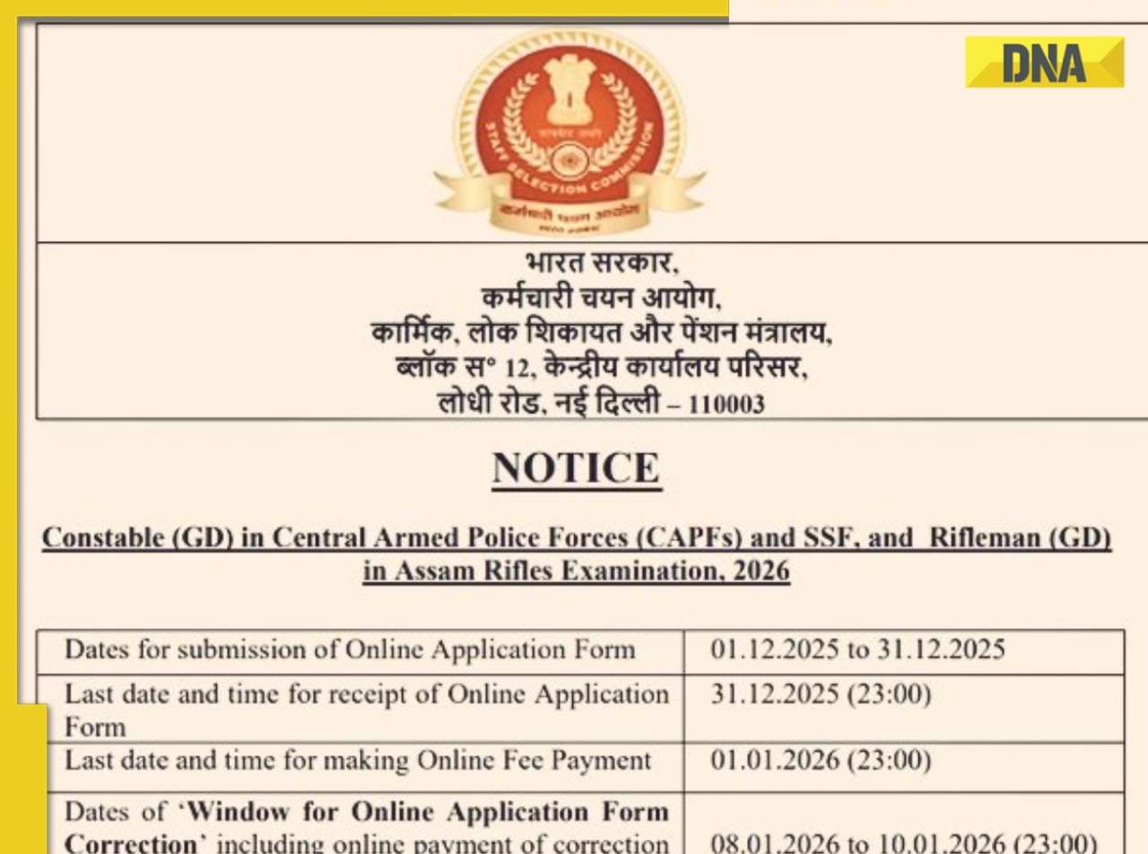 - सुधार शुल्क के ऑनलाइन भुगतान सहित ‘ऑनलाइन आवेदन पत्र सुधार के लिए विंडो’ की तिथियां – 08.01.2026 से 10.01.2026 (23:00)