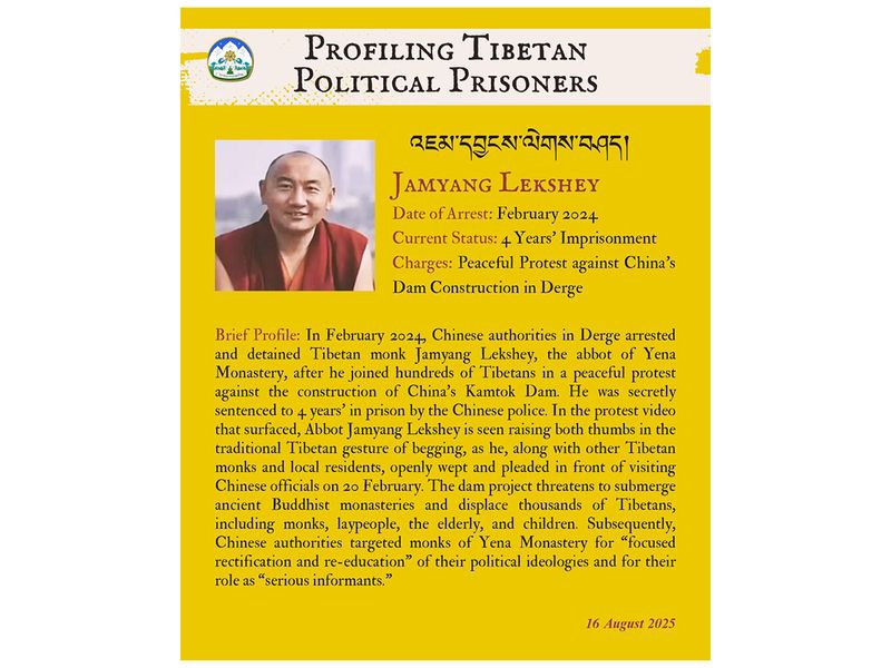 एक्स पर एक पोस्ट में, सीटीए ने कहा कि एबोट जामयांग लेक्सशे, डेरज में येन मठ के प्रमुख, फरवरी 2024 में चीनी-निर्मित कामटोक बांध के खिलाफ शांतिपूर्ण प्रदर्शन में सैकड़ों तिब्बतियों में शामिल होने के बाद गिरफ्तार किया गया था।