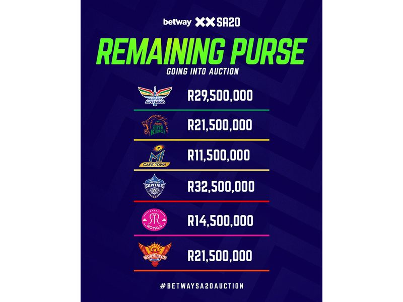 दो बार के चैंपियन सनराइजर्स ईस्टर्न केप पिछली नीलामी में प्रेमी ऑपरेटर रहे हैं और अभी भी 0.522 मिलियन अमरीकी डालर के लिए ट्रिस्टन स्टब्स की रिकॉर्ड नीलामी खरीद का दावा करते हैं।